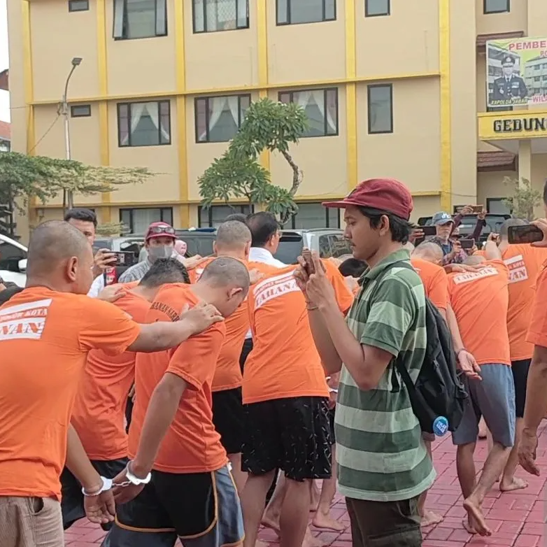 para tersangka pengedar dan pemakai narkoba dan narkotika saat digiring usai ungkap kasus di Mapolresta Bogor Kota, Senin (18/12/2023). (ANTARA/Linna Susanti)
